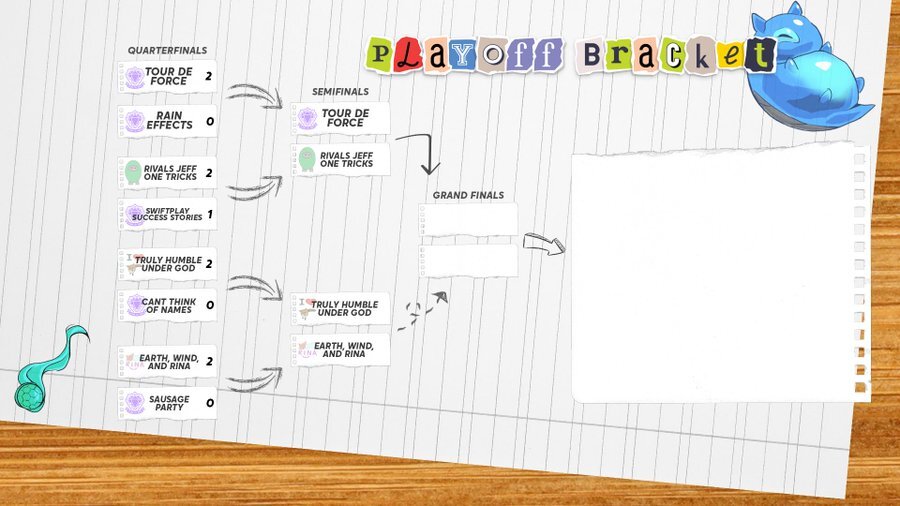 These teams made it through the group stage and were ready for the Playoffs! All matches in the Playoffs were best-of-3 in a single-elimination bracket. Most teams in the top sixteen would take their opponents by 2-0, sliding into the top eight. Tour de force, RAIN EFFECTS, rivals jeff one trick, swiftplay success stories, Truly Humble Under God, cant think of names, and Sausage Party were all victorious in 2-0 battles that earned them a spot in the top eight. The last team to make it to the top eight was earth, wind, and rina who battled it out against Nully’s Number Noobs. It came down to the wire! Both teams had a win on the board, but it would ultimately be earth, wind, and rina who would claim that final spot.